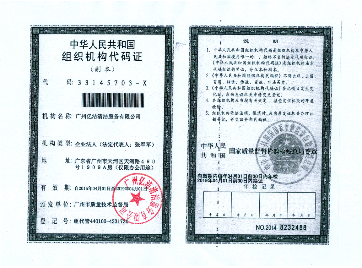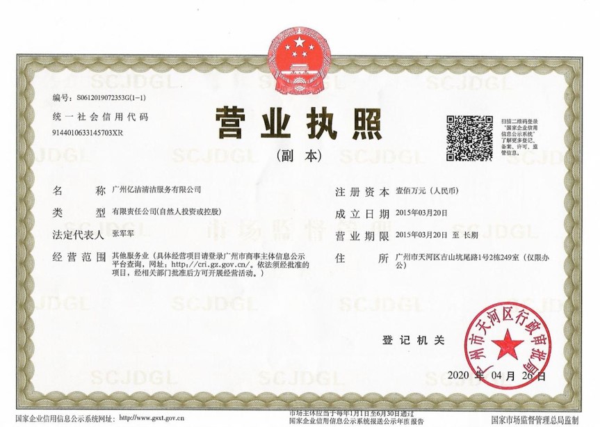 廣州億潔清潔服務(wù)有限公司是經(jīng)廣州市工商行政管理局批準成立的(注冊資本:100萬元人民幣)。具有獨立法人資質(zhì)。公司成立2015年,公司具備完善的管理體系和高素質(zhì)管理隊伍,擁有特種技術(shù)人員33名,保潔服務(wù)人員上萬名,覆蓋廣州市,能及時調(diào)配并快速投入高效運行。我們的每個員工都經(jīng)過公司的嚴格篩選,嚴格培訓,定期培訓后持證上崗以保證服務(wù)品質(zhì),保障客戶的權(quán)利,利益,形象等不受損失。 廣州億潔清潔公司是一家設(shè)備齊全,技術(shù)強大的綜合型清潔服務(wù)公司,為客戶提供完善服務(wù)尊定了堅定的基礎(chǔ)。 司于2010年全面推行了ISO9001質(zhì)量管理體系認證和ISO14001國際環(huán)保體系認證。先后獲得廣州高層建筑外墻清洗維修作業(yè)【安全資質(zhì)證書】、【廣州環(huán)衛(wèi)企業(yè)等級證書C級資質(zhì)】、廣州疾控中心頒發(fā)的【四害消殺服務(wù)資質(zhì)證】、【空氣治理A級資質(zhì)】、中國石材協(xié)會頒發(fā)的【石材資質(zhì)B級資質(zhì)】等。 廣州億潔清潔服務(wù)有限公司致力于打造專業(yè)、實惠、靠譜的保潔服務(wù)公司,把專業(yè)的事情交給專業(yè)的我們,您放心! 億潔清潔服務(wù)項目: 廣州保潔服務(wù):新建樓宇、別墅、酒店、醫(yī)院、辦公樓、賓館、企事業(yè)單位廠房竣工后開荒及裝修后精細保潔.工程保潔服務(wù)。 廣州物業(yè)托管:為廣州市各大企事業(yè)單位、賓館、政府機關(guān)、小區(qū)物業(yè)、酒店及廠房提供專業(yè)化保潔、園林、設(shè)施維護等管理服務(wù)。 廣州高空作業(yè):高空玻璃幕...[詳情]